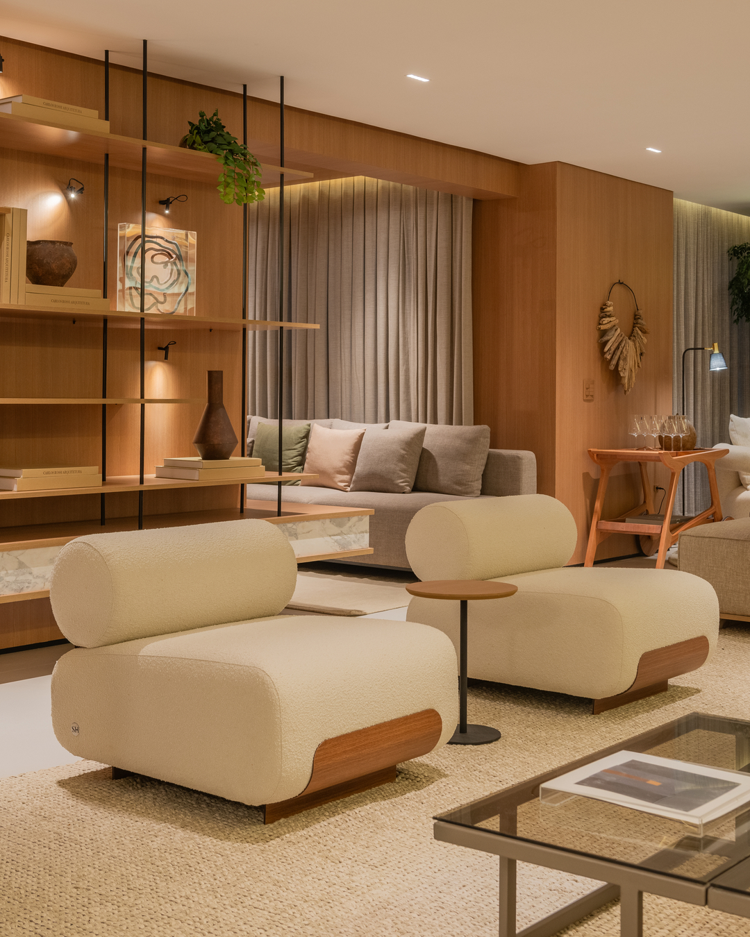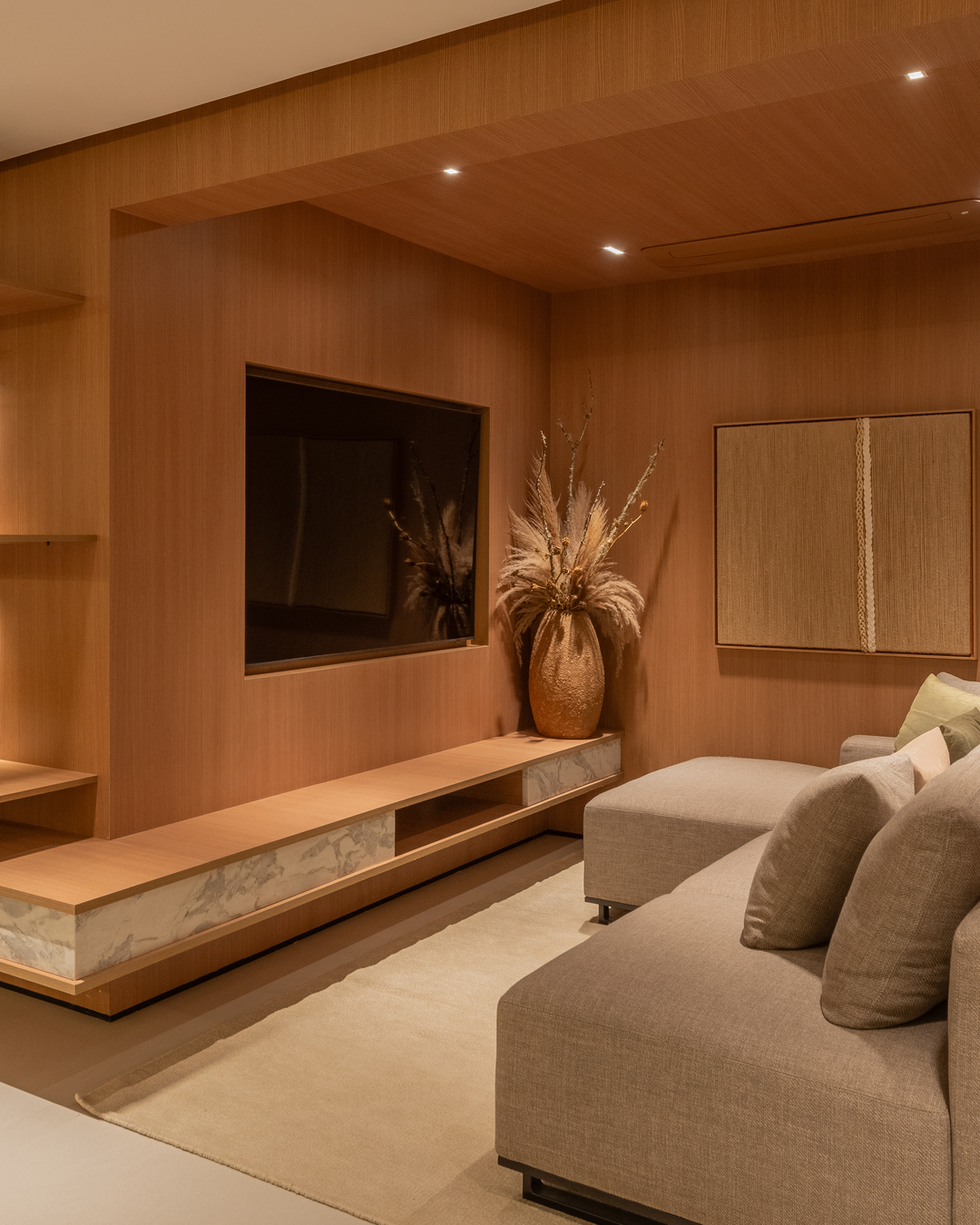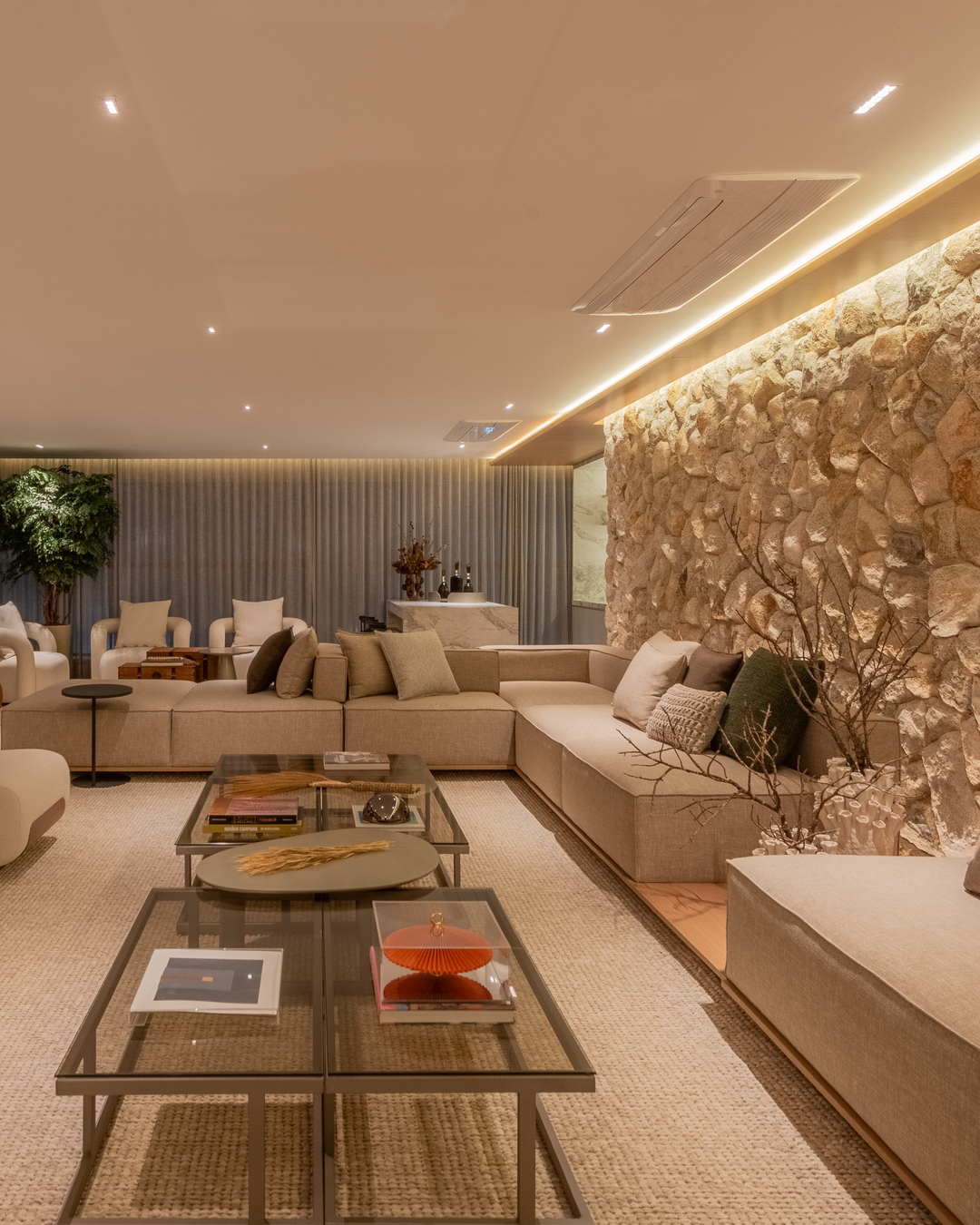 A paleta com tonalidades neutras, os materiais nobres e naturais — a exemplo da pedra moledo e do mármore branco paraná — e a marcenaria em tom avelã ditam o estilo imponente e, ao mesmo tempo, aconchegante na área gourmet, na sala de TV e no living deste apartamento decorado de 231 m². O projeto luminotécnico valoriza volumes, salienta texturas e cria cenas variadas, proporcionando diferentes atmosferas.