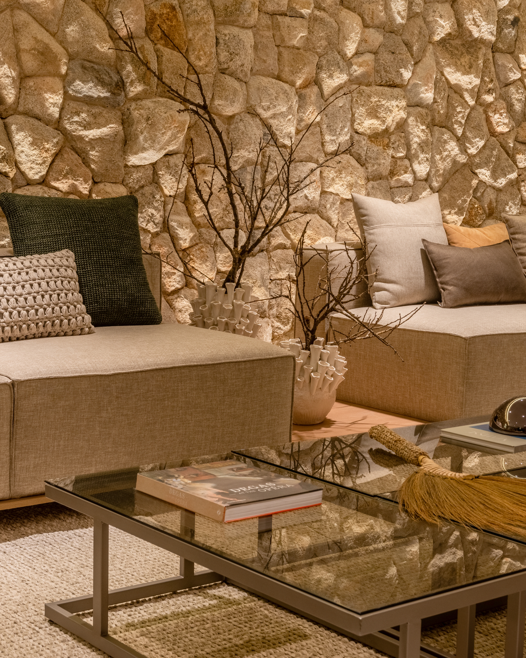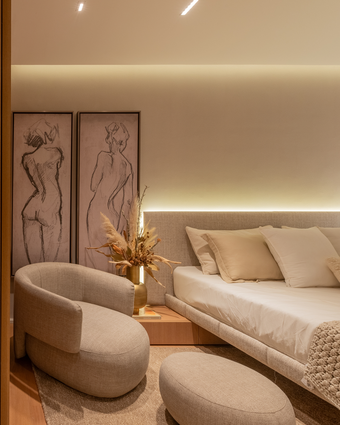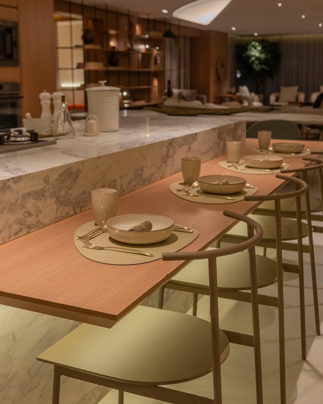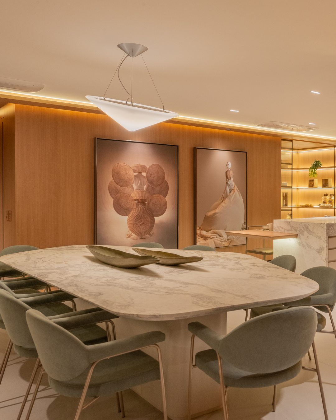 A paleta com tonalidades neutras, os materiais nobres e naturais — a exemplo da pedra moledo e do mármore branco paraná — e a marcenaria em tom avelã ditam o estilo imponente e, ao mesmo tempo, aconchegante na área gourmet, na sala de TV e no living deste apartamento decorado de 231 m². O projeto luminotécnico valoriza volumes, salienta texturas e cria cenas variadas, proporcionando diferentes atmosferas.