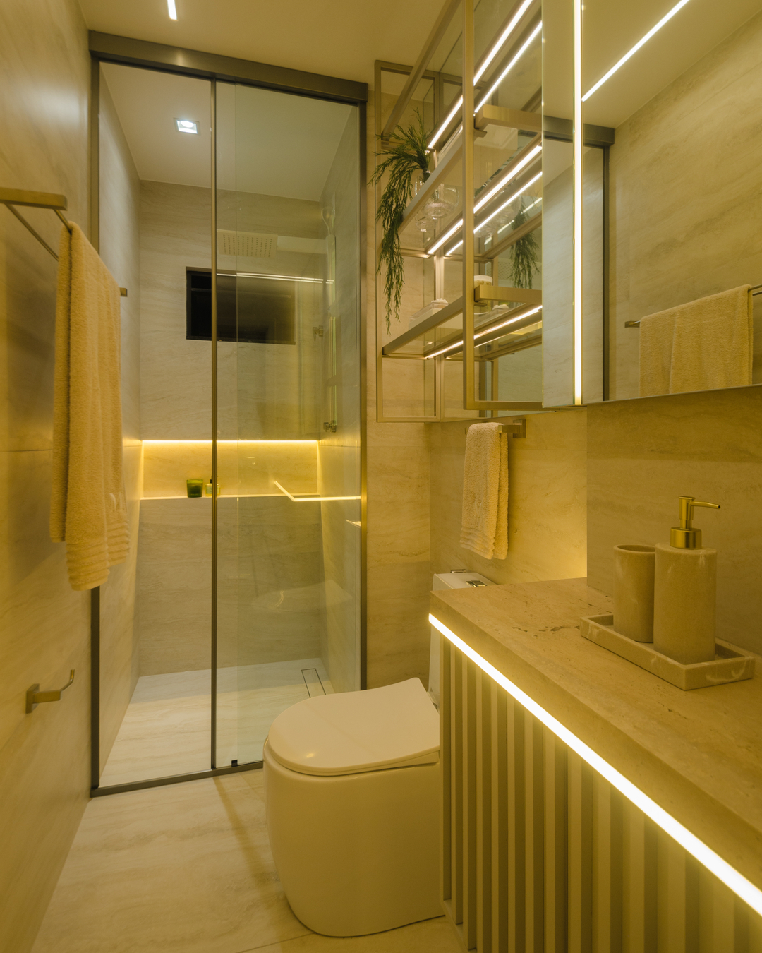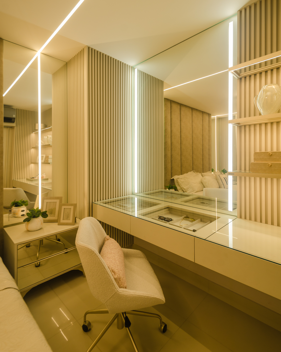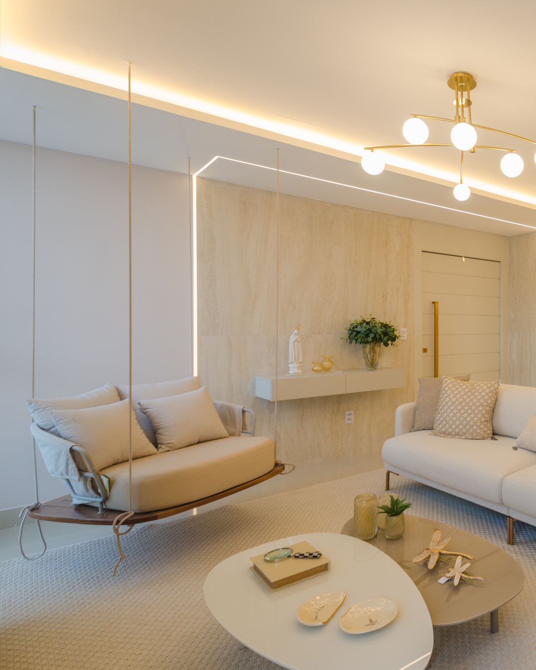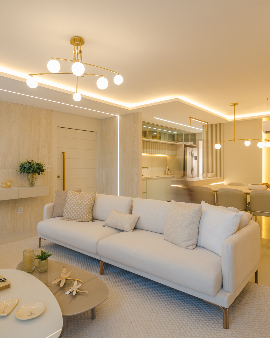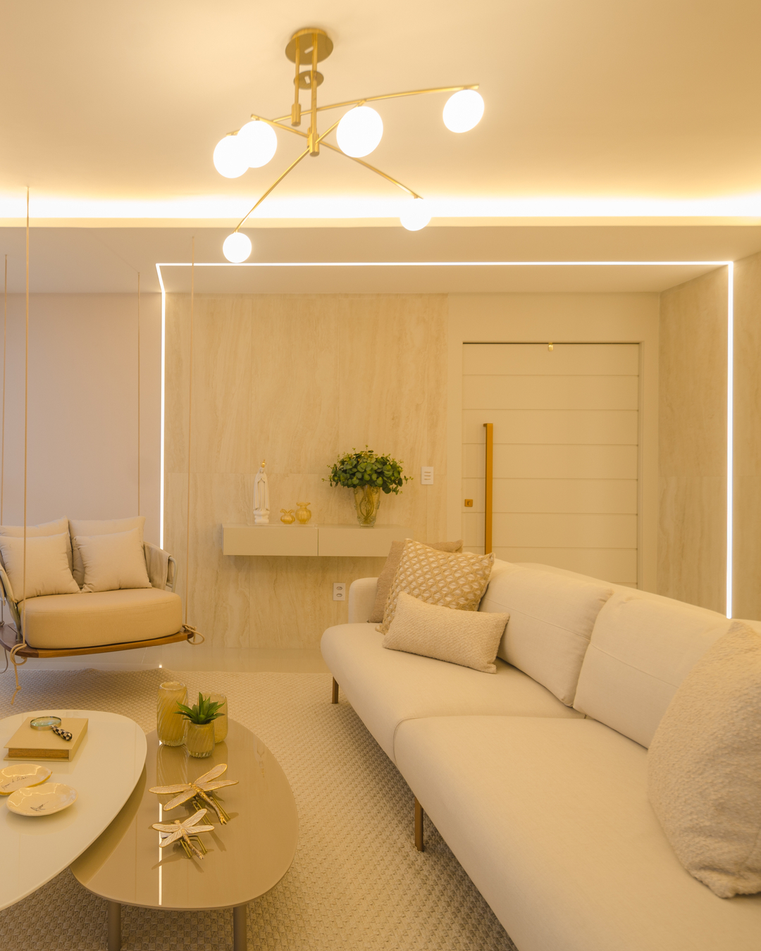 A cliente pediu e as arquitetas Nayara Salgado e Nayara Ferreira a atenderam: nada de cores contrastantes no apartamento de 109 m2 em Macapá. O visual monocromático, em nuances de creme, bege e dourado, foi construído com revestimentos como travertino romano, porcelanato, pedra industrializada e madeira laqueada, destacados pela iluminação com led, ora em perfis instalados em sancas, ora embutidos na marcenaria.