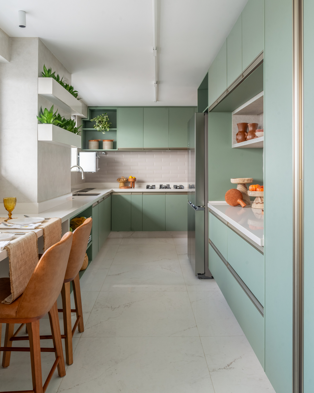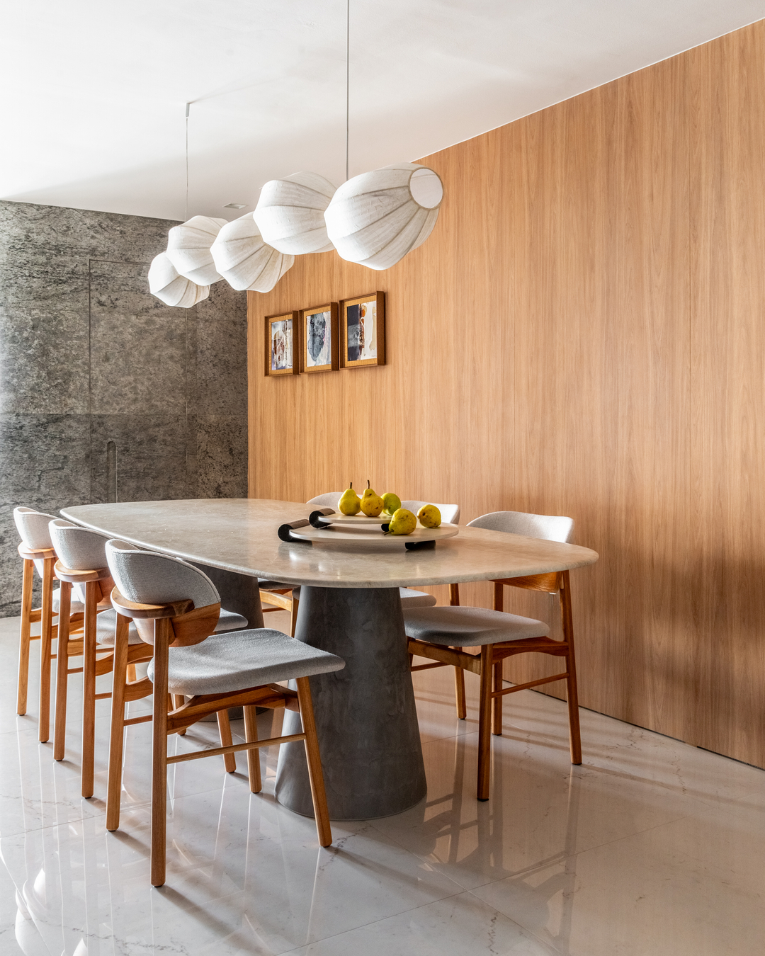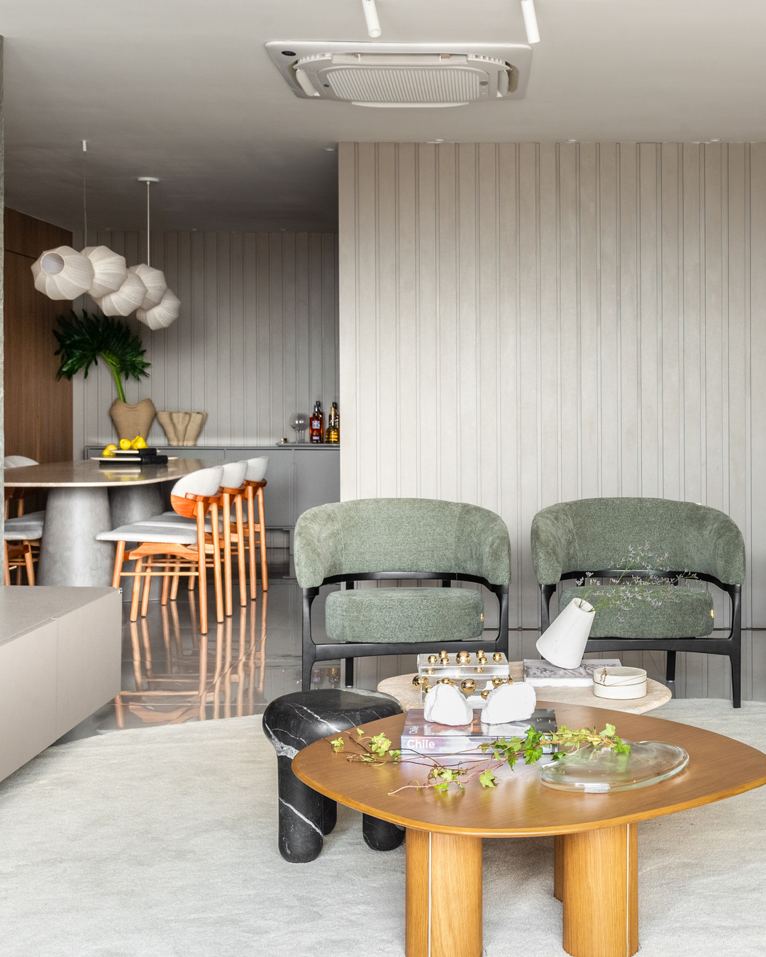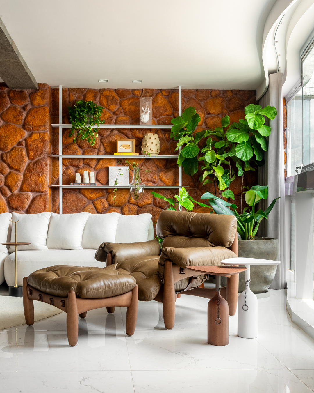 Unir a varanda ao interior do apartamento de 181 m², comprado na planta, foi a estratégia dos arquitetos Daniel Teixeira e Thaís Brito para ampliar a sala e equipá-la com móveis maiores. Os ganhos se estenderam à luminosidade e à fluidez dos ambientes. Pontos de verde e tons terrosos quebram a paleta prioritariamente neutra e, somados às superfícies de madeira e pedra, trazem ao décor brasilidade e conexão com a natureza.