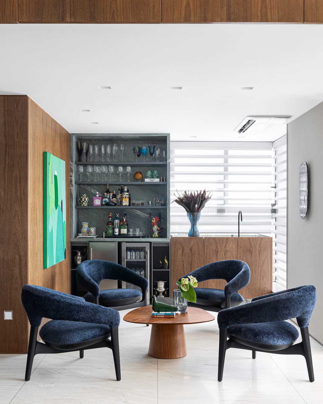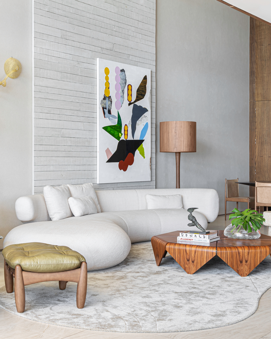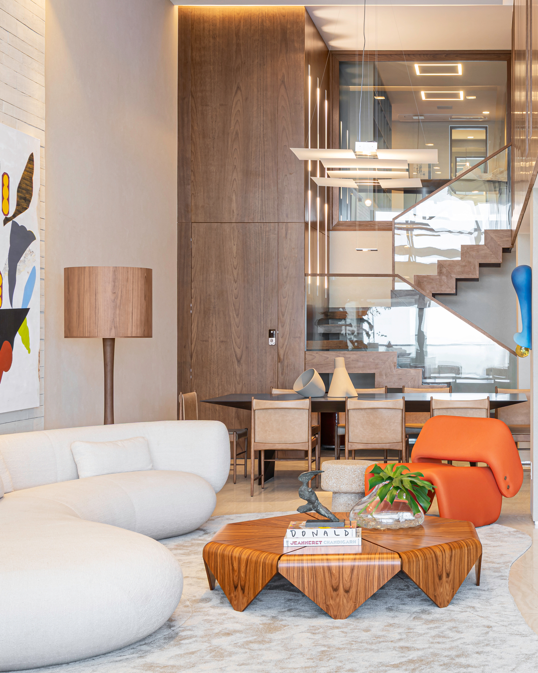 Kassio Fontoura e Marcela Grasselli fizeram mágica neste apartamento: sendo de cobertura, ele cresceu em altura (ganhou um segundo andar) e extensão, aproveitando a varanda recuada como núcleo gourmet junto à piscina, sob um teto retrátil. A área social agregou adega e bar, enquanto a suíte máster ficou maior. Coloridas obras de arte temperam os beges e off-whites da pedra travertino, das lâminas de nogueira peruana e dos estofados de linho.