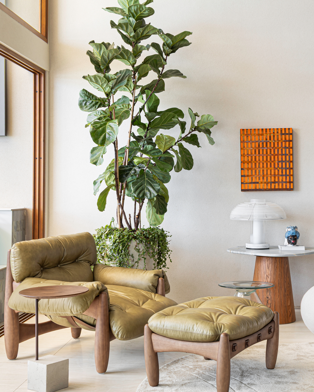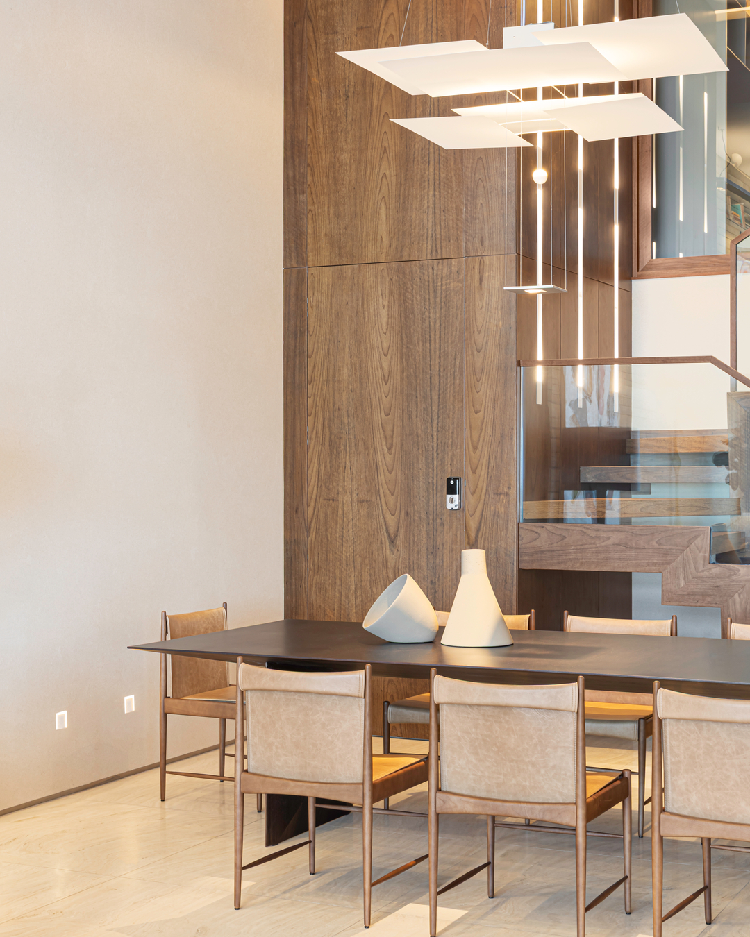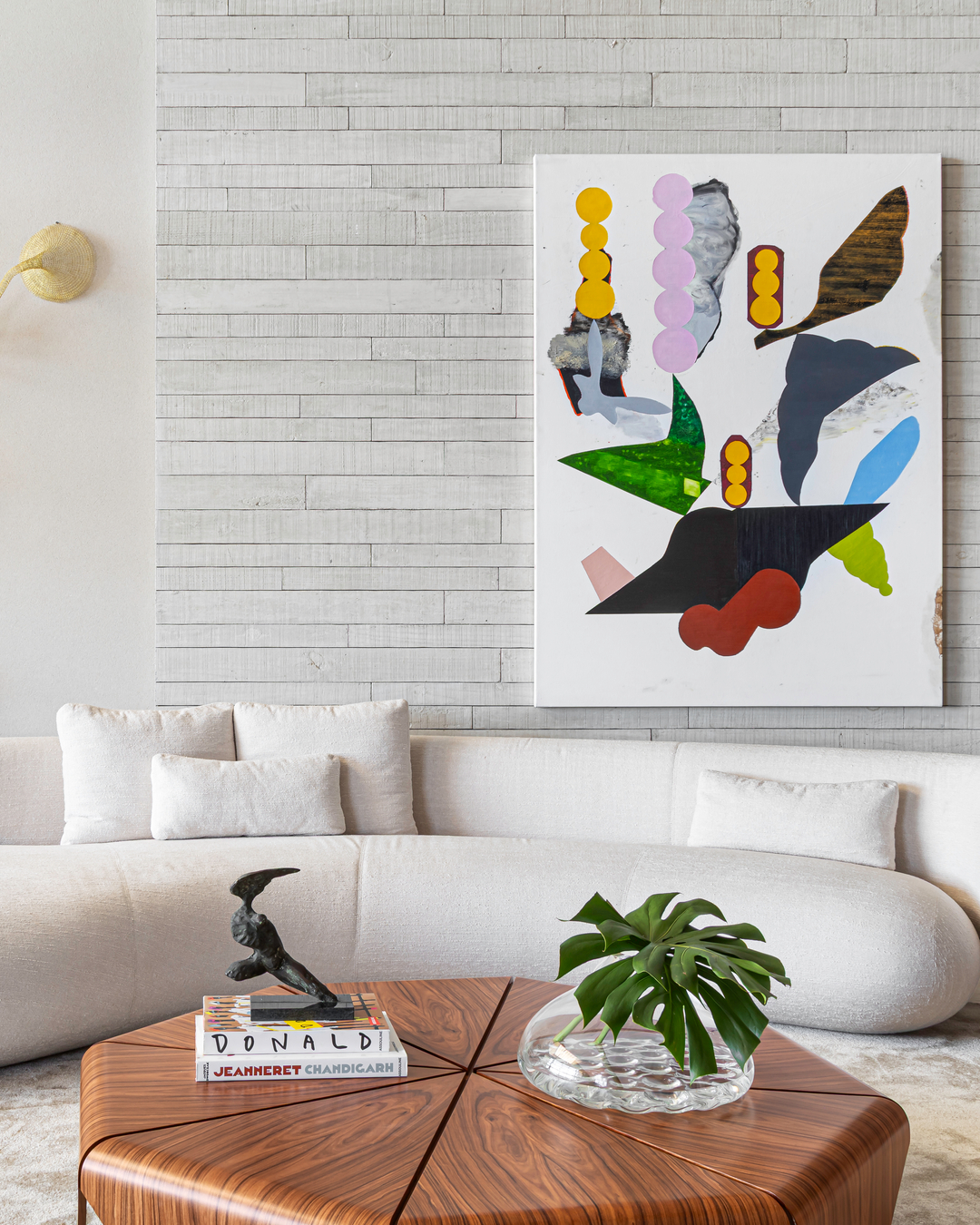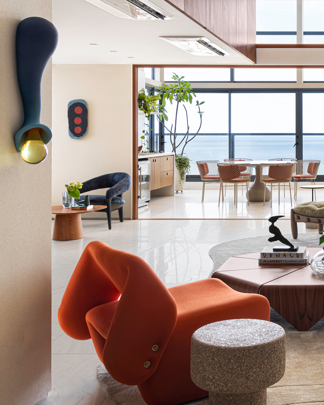 Kassio Fontoura e Marcela Grasselli fizeram mágica neste apartamento: sendo de cobertura, ele cresceu em altura (ganhou um segundo andar) e extensão, aproveitando a varanda recuada como núcleo gourmet junto à piscina, sob um teto retrátil. A área social agregou adega e bar, enquanto a suíte máster ficou maior. Coloridas obras de arte temperam os beges e off-whites da pedra travertino, das lâminas de nogueira peruana e dos estofados de linho.