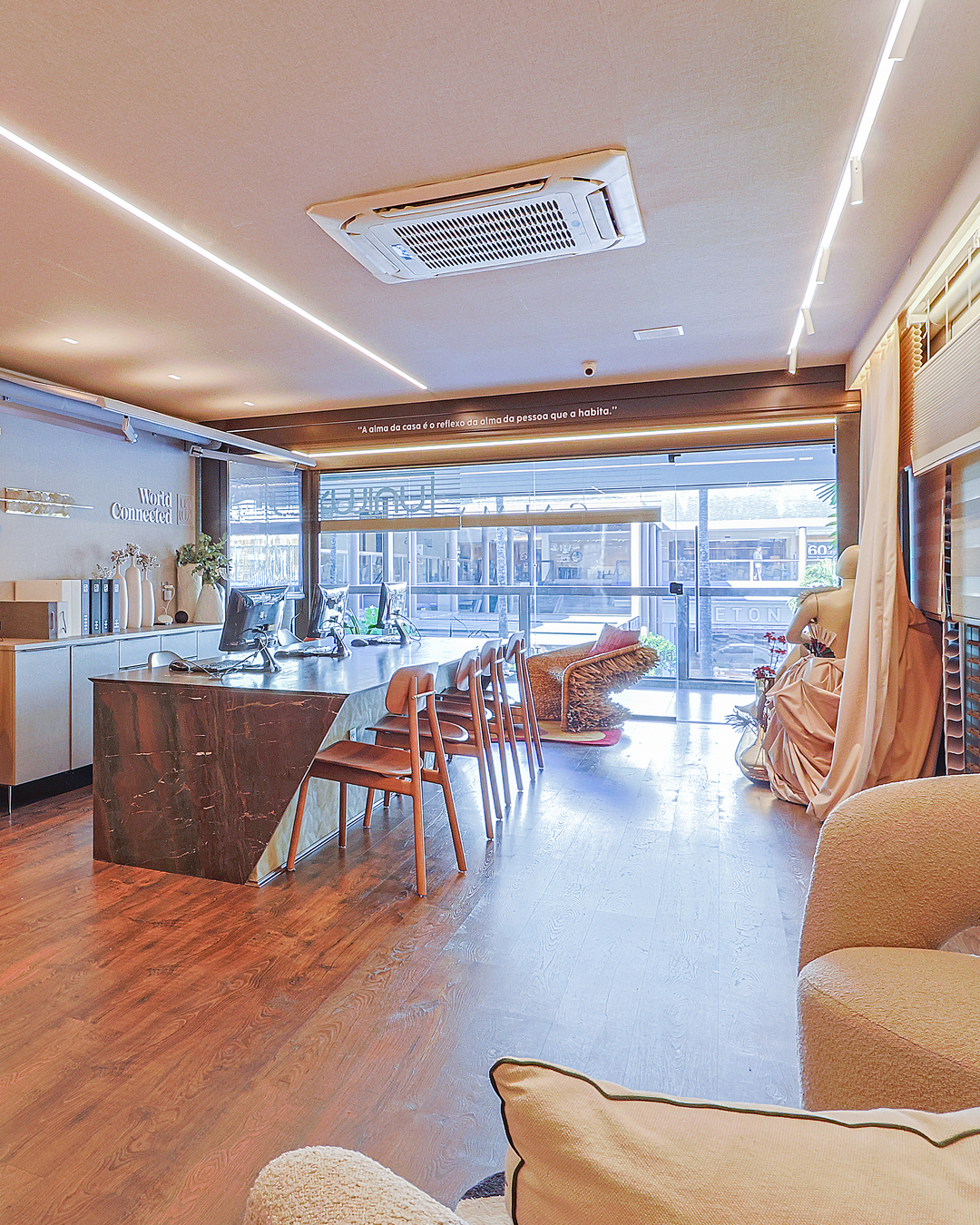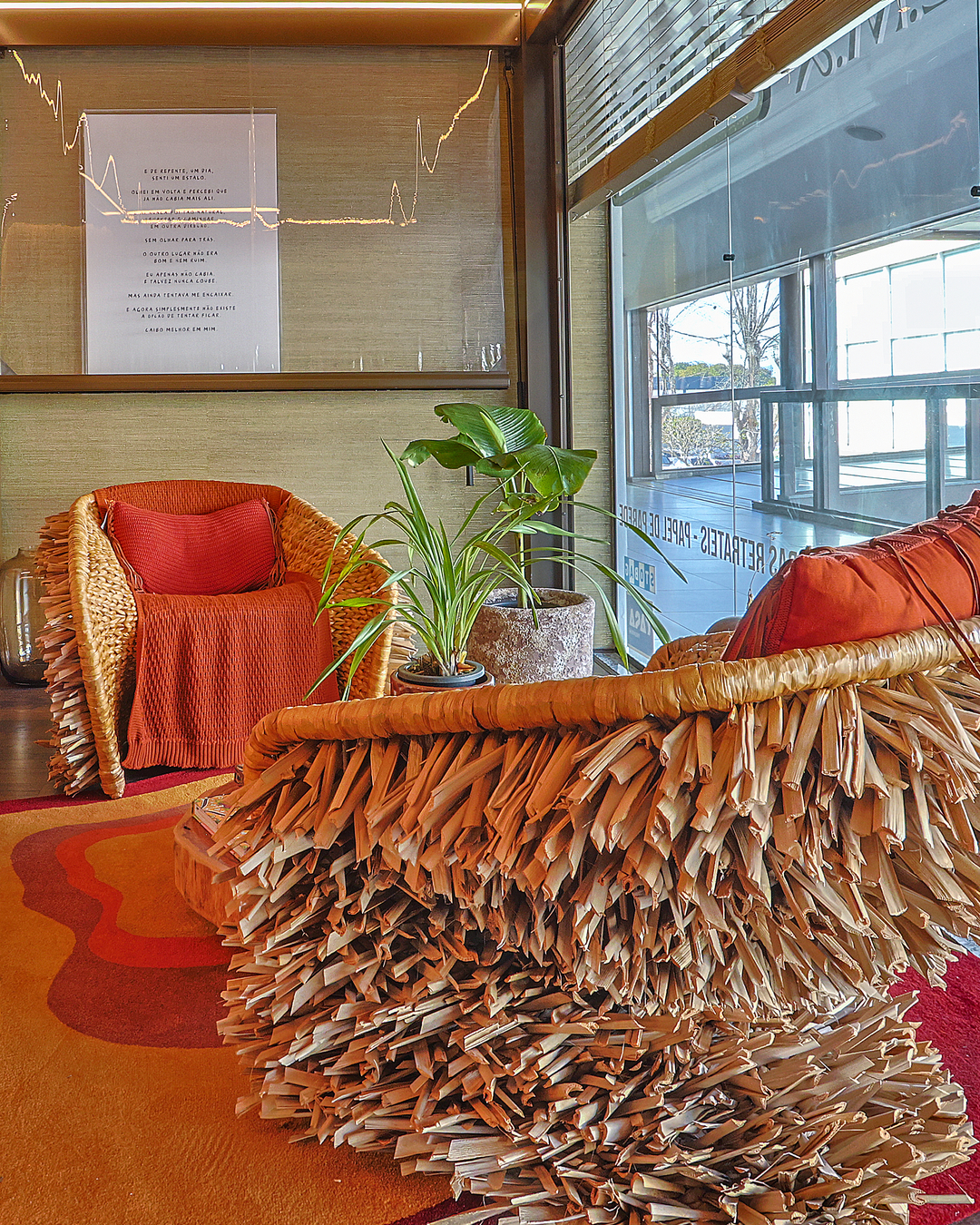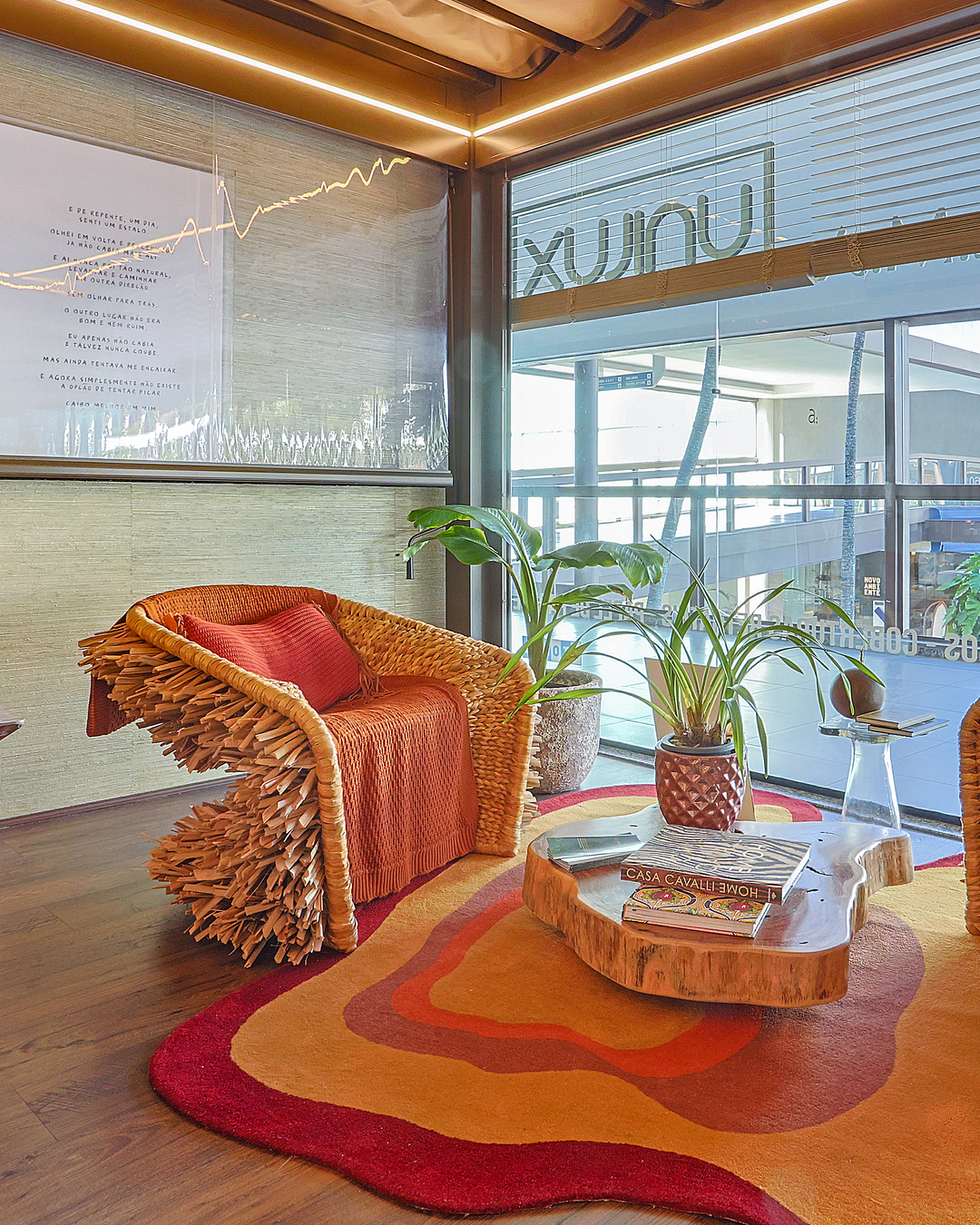 O objetivo principal da arquiteta Heloisa Carneiro neste projeto de interiores foi levar o usuário a se sentir abraçado pelo ambiente de 50 m², uma loja em um shopping de arquitetura no Rio de Janeiro. Palhas, papéis de parede, pedra e couro foram determinantes para a percepção do espaço como uma extensão da casa.