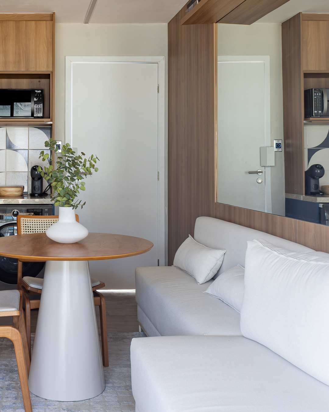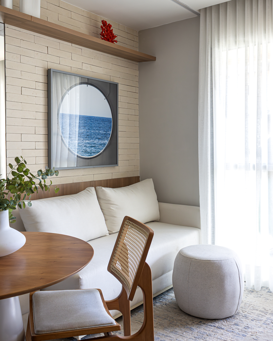 O sofá se conecta ao banco e este atende a mesa de jantar. Com soluções personalizadas como essa, a arquiteta Manuela Guida tirou o melhor proveito dos 50 m² de área do apartamento modelo de um empreendimento na Praia de Camboinhas, em Niterói. O layout não só integrou os recantos como também valorizou com a luz natural e a iluminação indireta a textura dos acabamentos, entre eles os tijolinhos claros e a madeira.