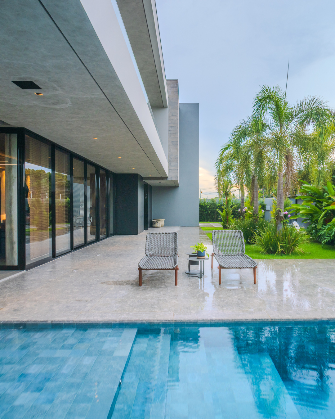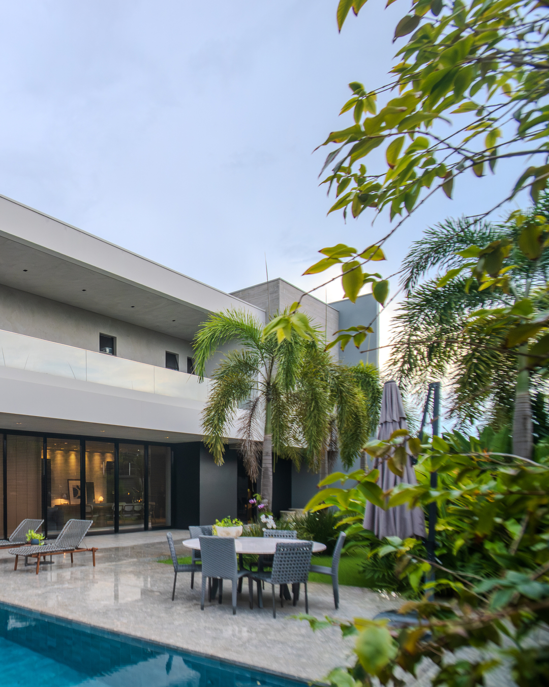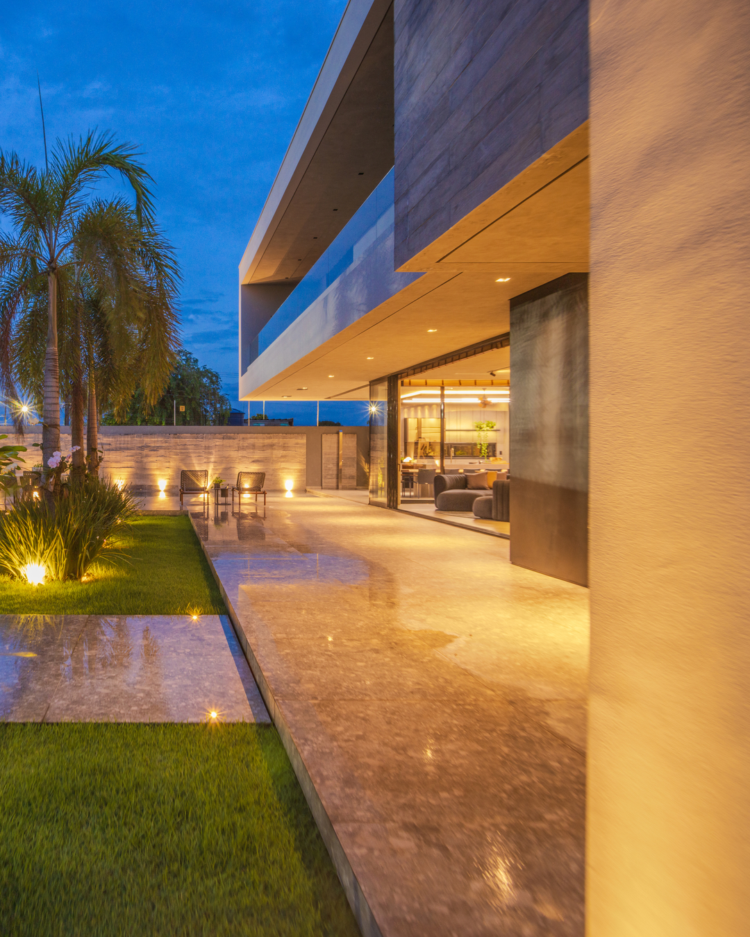 A arquiteta Natássia Cruz aproveitou a horizontalidade do terreno para conceber uma fachada que se destaca, combinando imponência e contemporaneidade em linhas retas e volumes que se sobrepõem. Os materiais reforçam a linguagem arquitetônica: concreto aparente e panos de vidro, emoldurados no vistoso paisagismo. Generosos, os espaços respondem à praticidade e à integração pedidas pelos clientes, um casal jovem de Boa Vista.