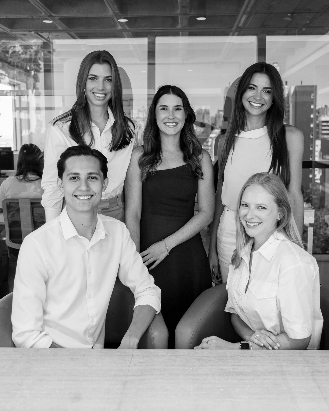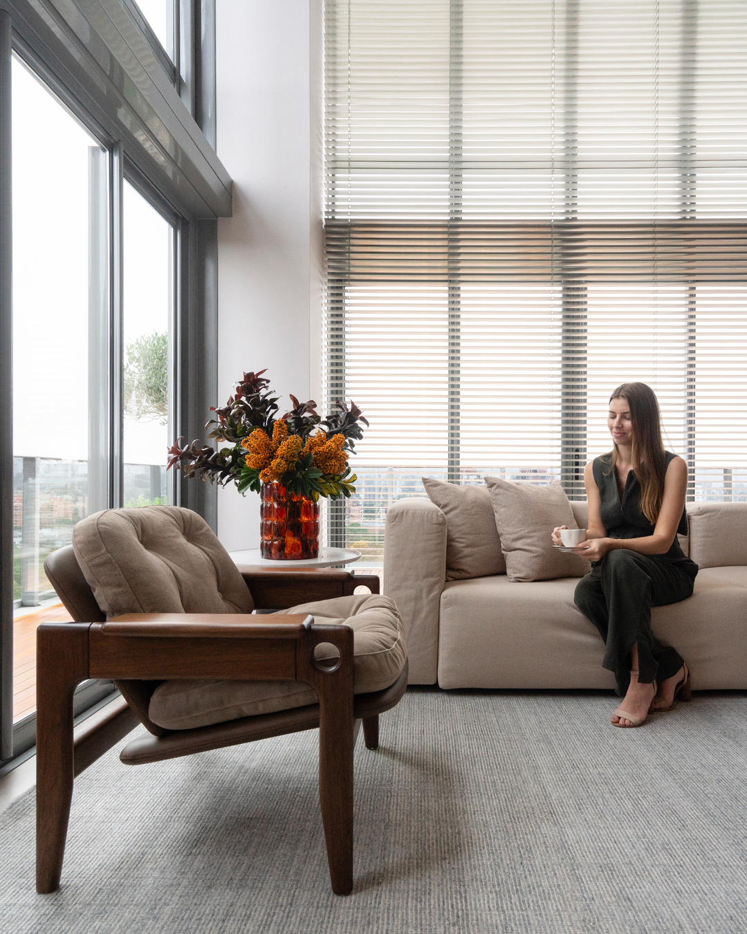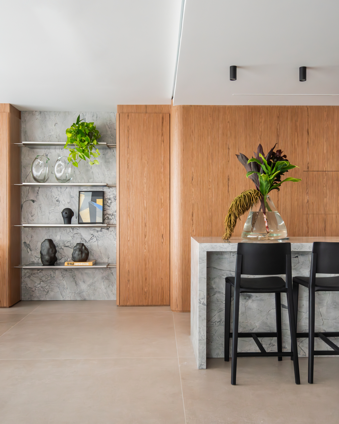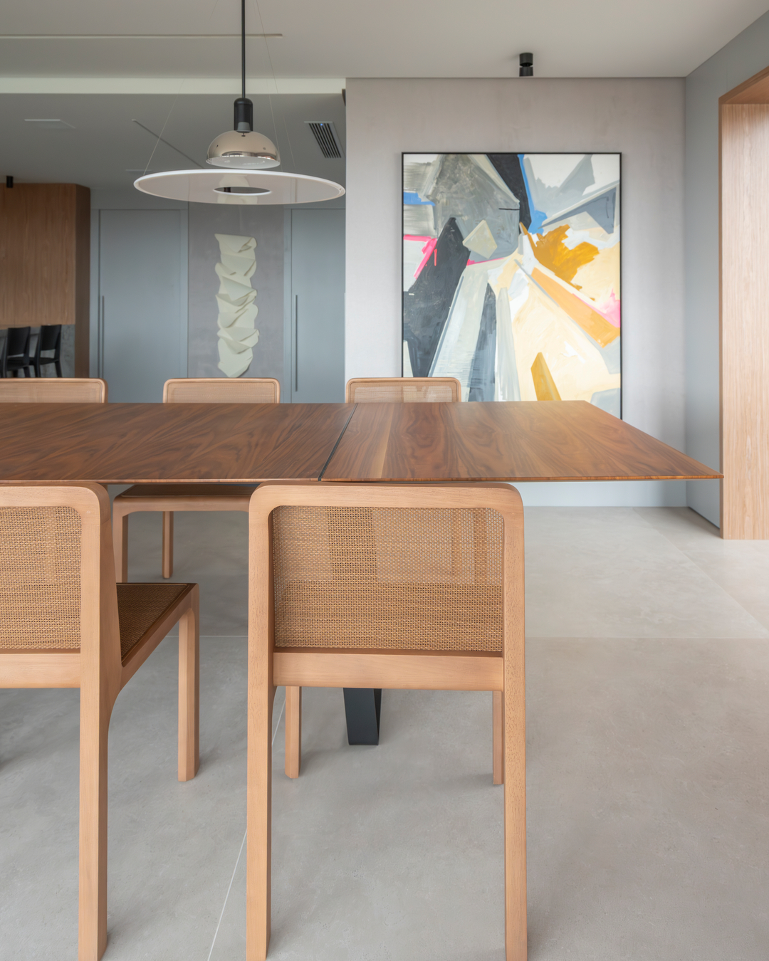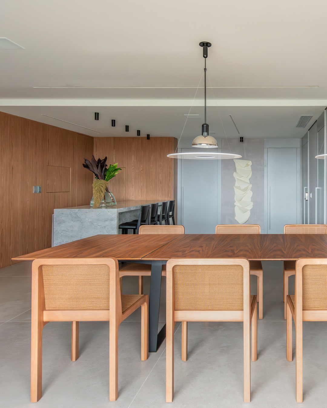 Jéssica Sperb, Victória Redecker, Gabriel Bauermann, Sara Marquezini e Natália Bassani elegeram lâmina de madeira e pedras naturais como carro-chefe do apartamento de 240 m². Elementos de inox e detalhes pretos acentuam o sotaque masculino dos ambientes, planejados para ser descomplicados e acolhedores no dia a dia em família e nos encontros com amigos. O design brasileiro e internacional se apresenta nos móveis e luminárias.