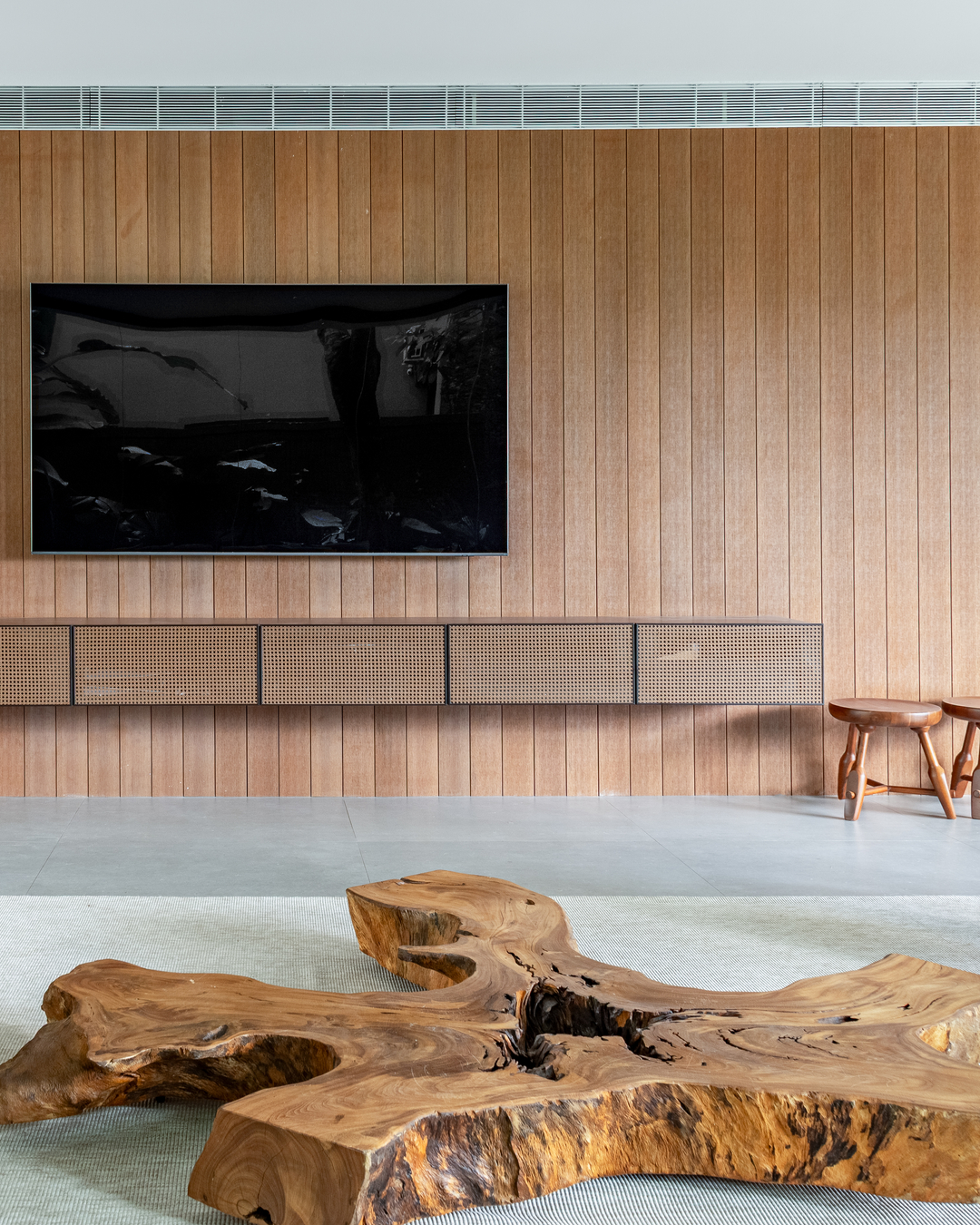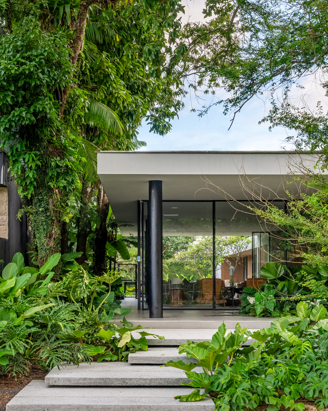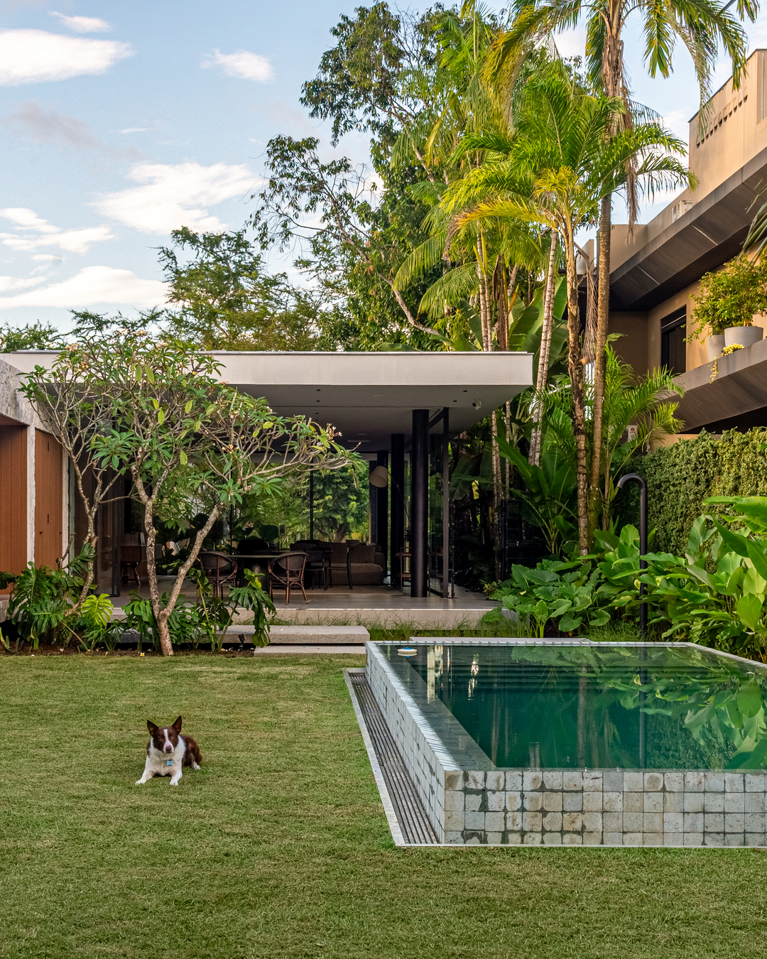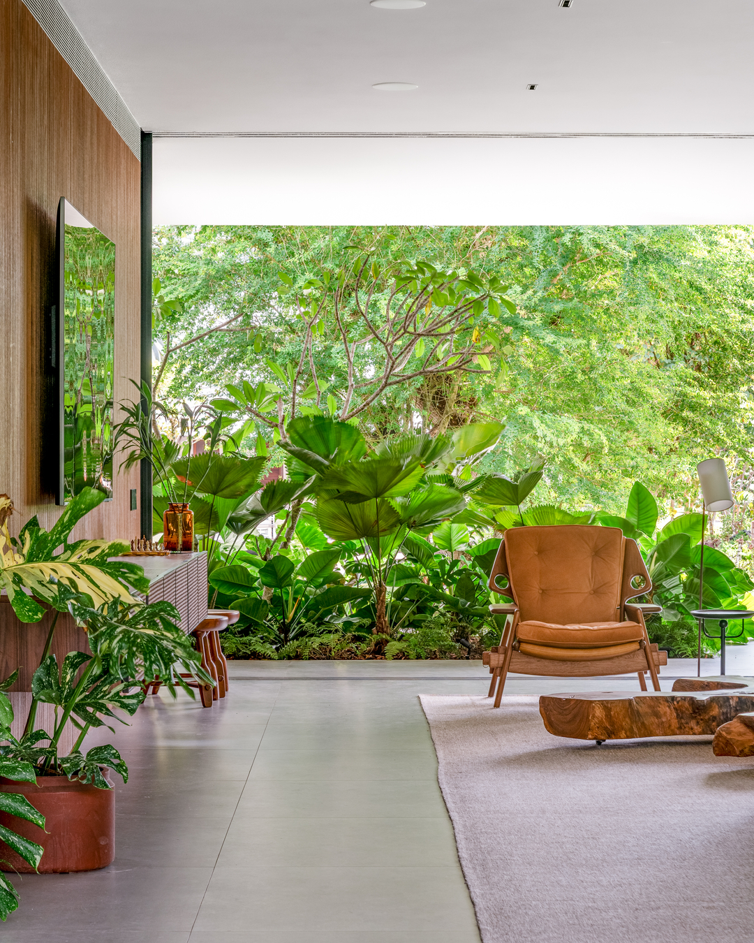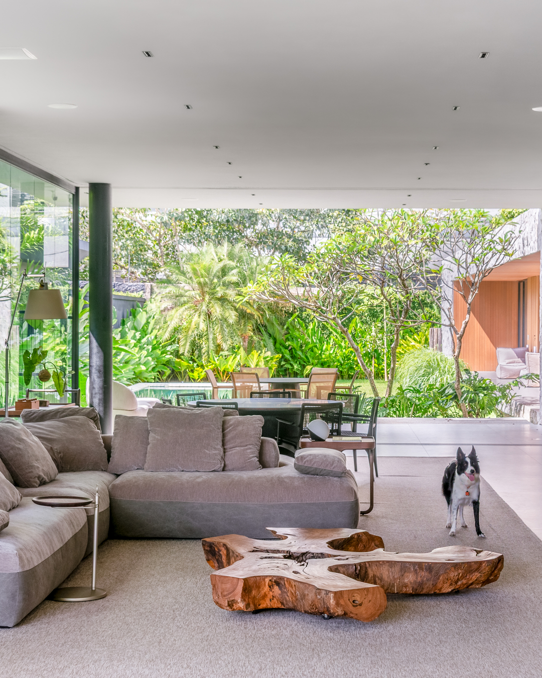 Os moradores queriam uma casa de linhas retas, livre de excessos na decoração e fortemente conectada ao jardim. Uma das condições era manter as árvores de grande porte na entrada e nas laterais do terreno. Assim nasceu a construção de 565 m² que conjuga dois volumes — um de madeira e outro de pedra — enlaçados por faces de vidro. Os arquitetos Guto Delgado e Mylena Oliveira não escondem a inspiração no modernismo brasileiro.