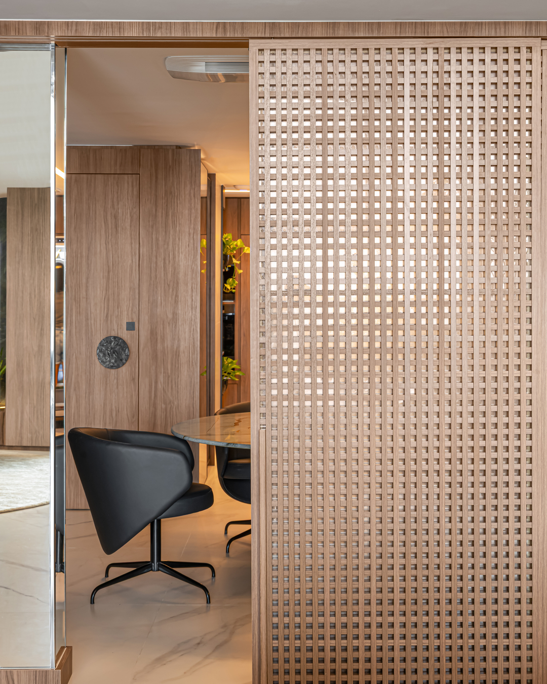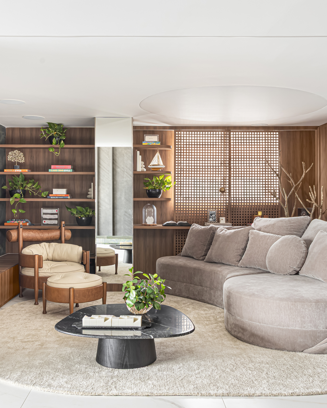 O capricho nos detalhes chama a atenção, desde a pedra natural em algumas paredes até os painéis de muxarabi que ora unem, oram isolam a copa e o living. Combinando integração, amplitude e privacidade, o projeto deu ao apartamento a sensação de casa, principalmente na área da piscina, que tem pé-direito duplo, teto retrátil e paisagismo. Os recantos de estar convidam ao descanso, com sofá e poltronas generosos.