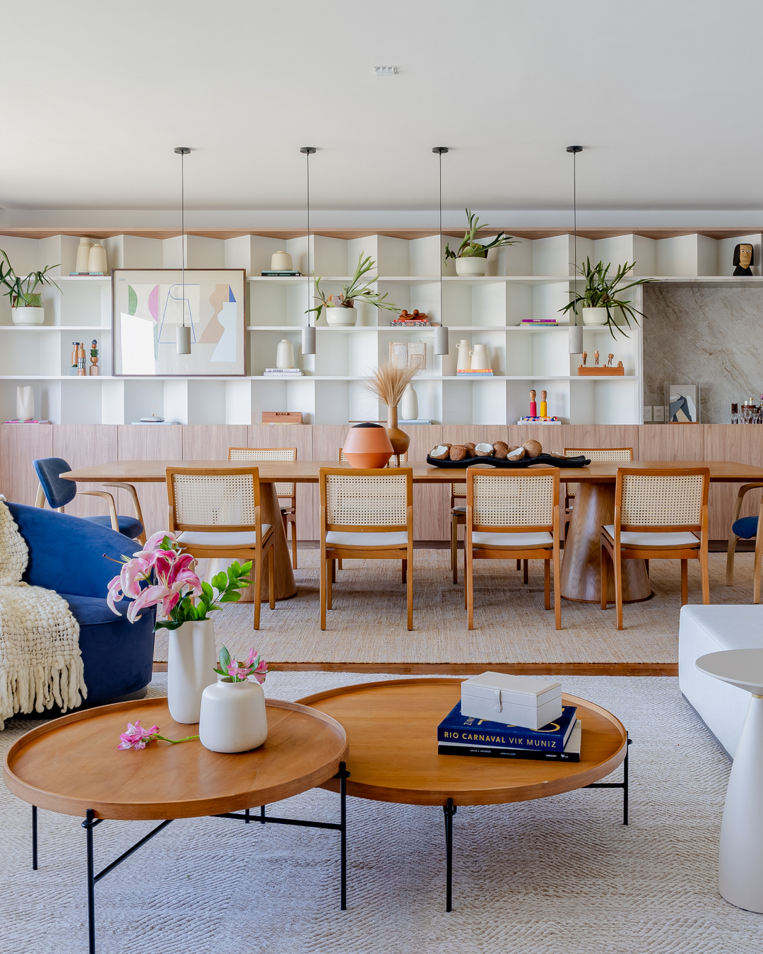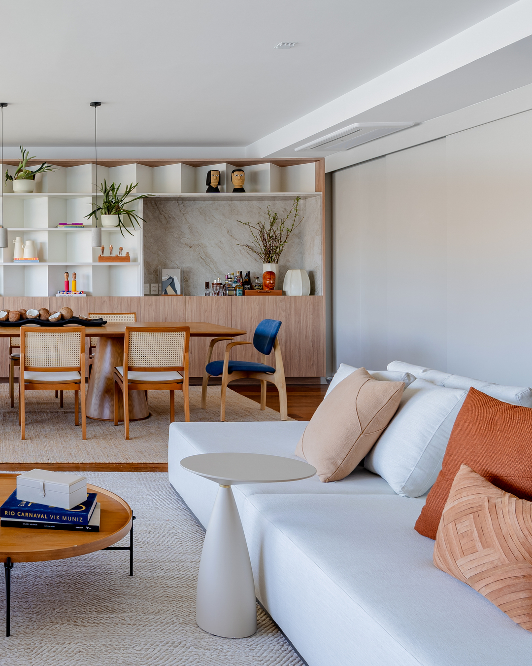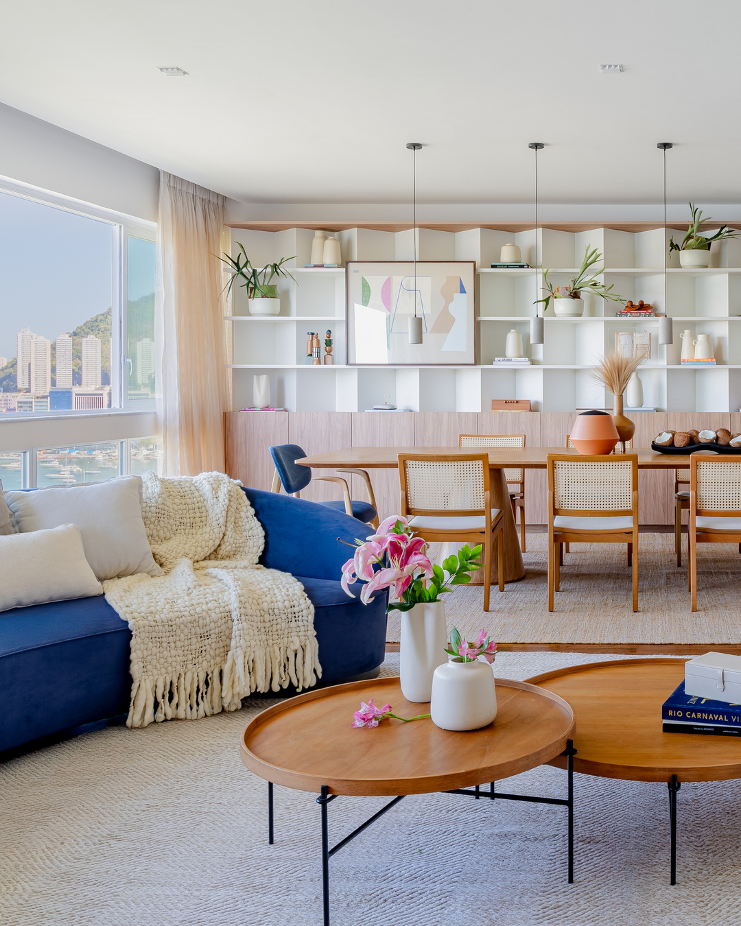 Com o Pão de Açúcar nas janelas, foi natural que Eglon Moura e Gabriel Vicente reorganizassem a planta ultrapassada e voltassem a zona social do apartamento de 270 m² para a vista, conectando sala e cozinha — esta virou espaço também para receber. Biblioteca e estúdio de pilates foram criados, e a circulação se fez mais fluida e funcional. Mármore, madeira e concreto se contrapõem nas superfícies, valorizados pela iluminação.