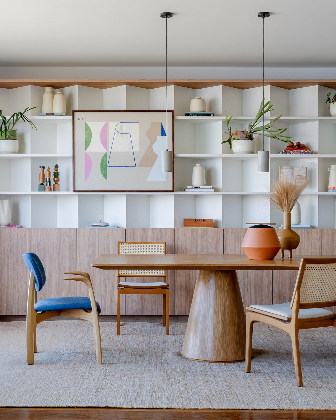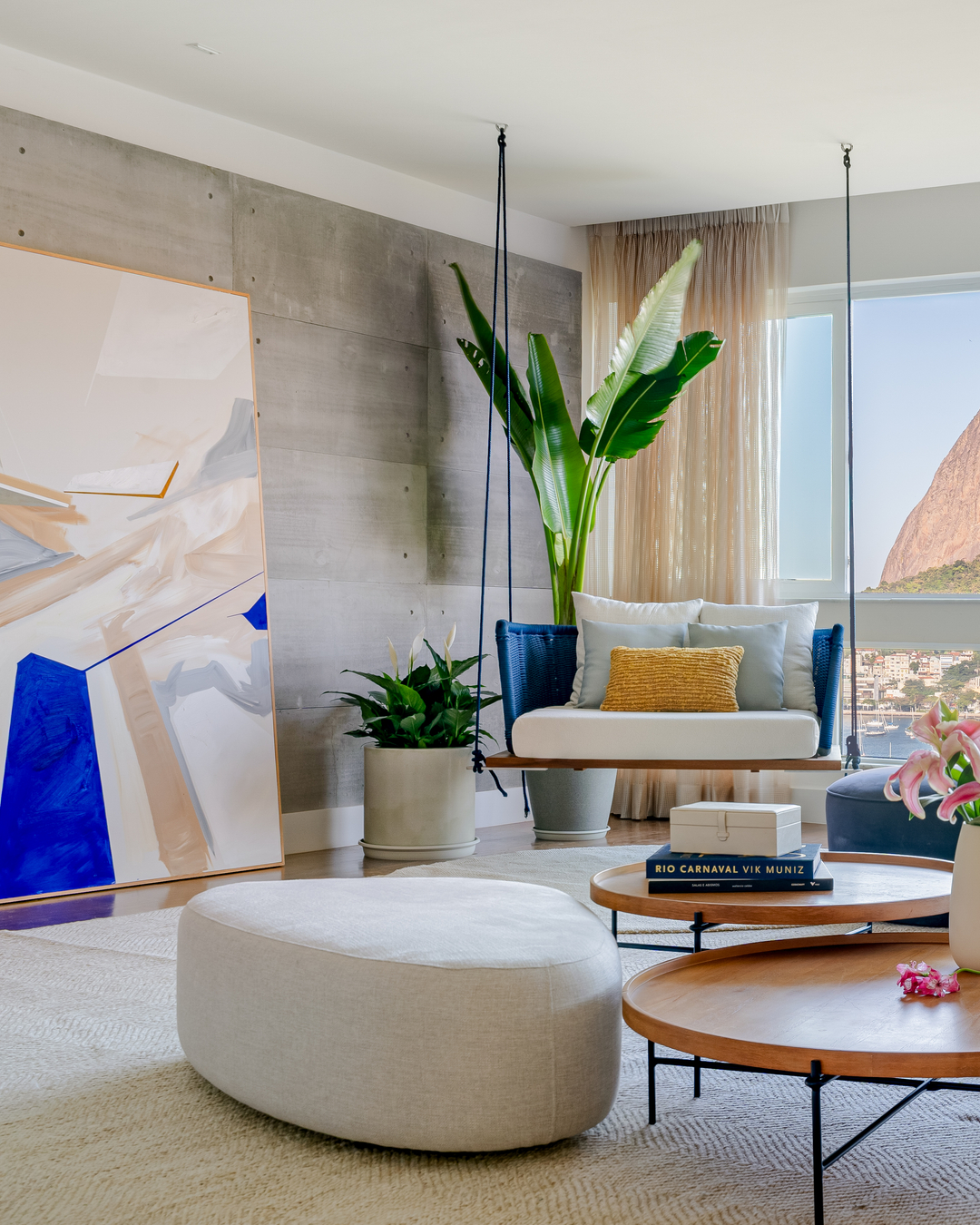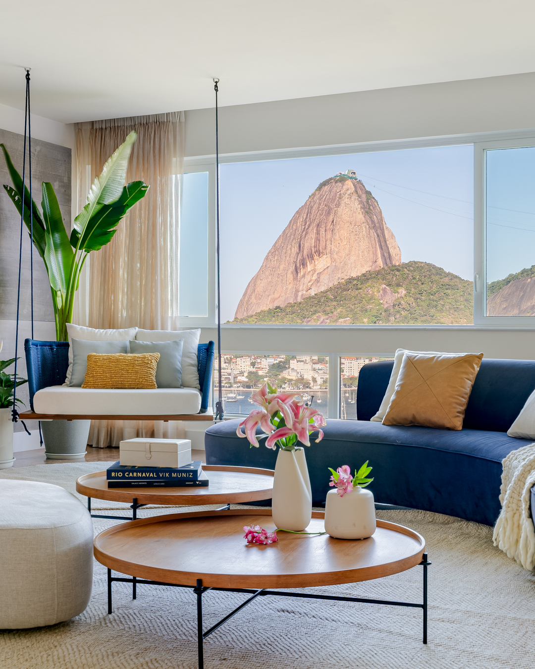 Com o Pão de Açúcar nas janelas, foi natural que Eglon Moura e Gabriel Vicente reorganizassem a planta ultrapassada e voltassem a zona social do apartamento de 270 m² para a vista, conectando sala e cozinha — esta virou espaço também para receber. Biblioteca e estúdio de pilates foram criados, e a circulação se fez mais fluida e funcional. Mármore, madeira e concreto se contrapõem nas superfícies, valorizados pela iluminação.