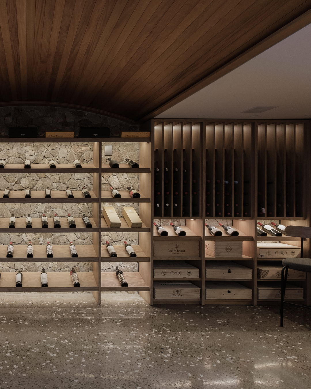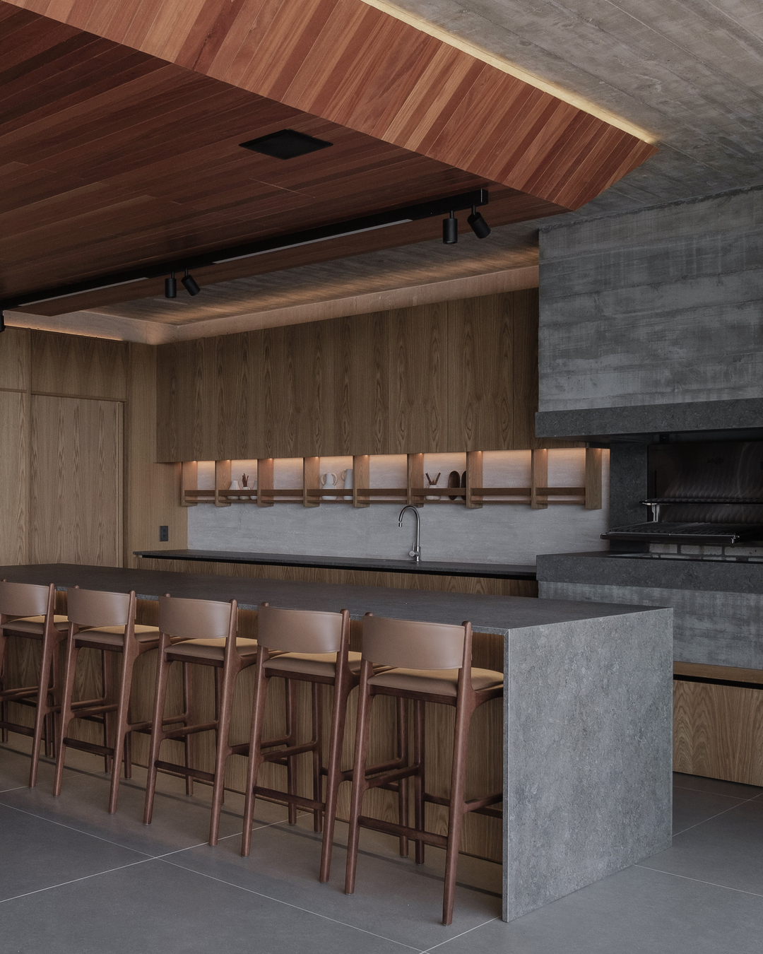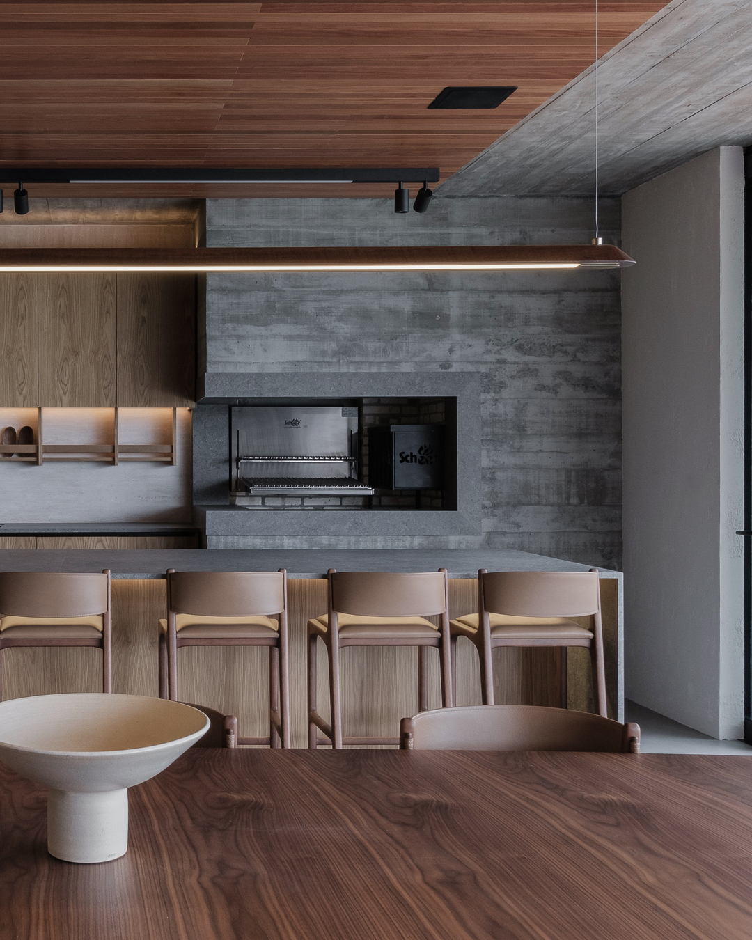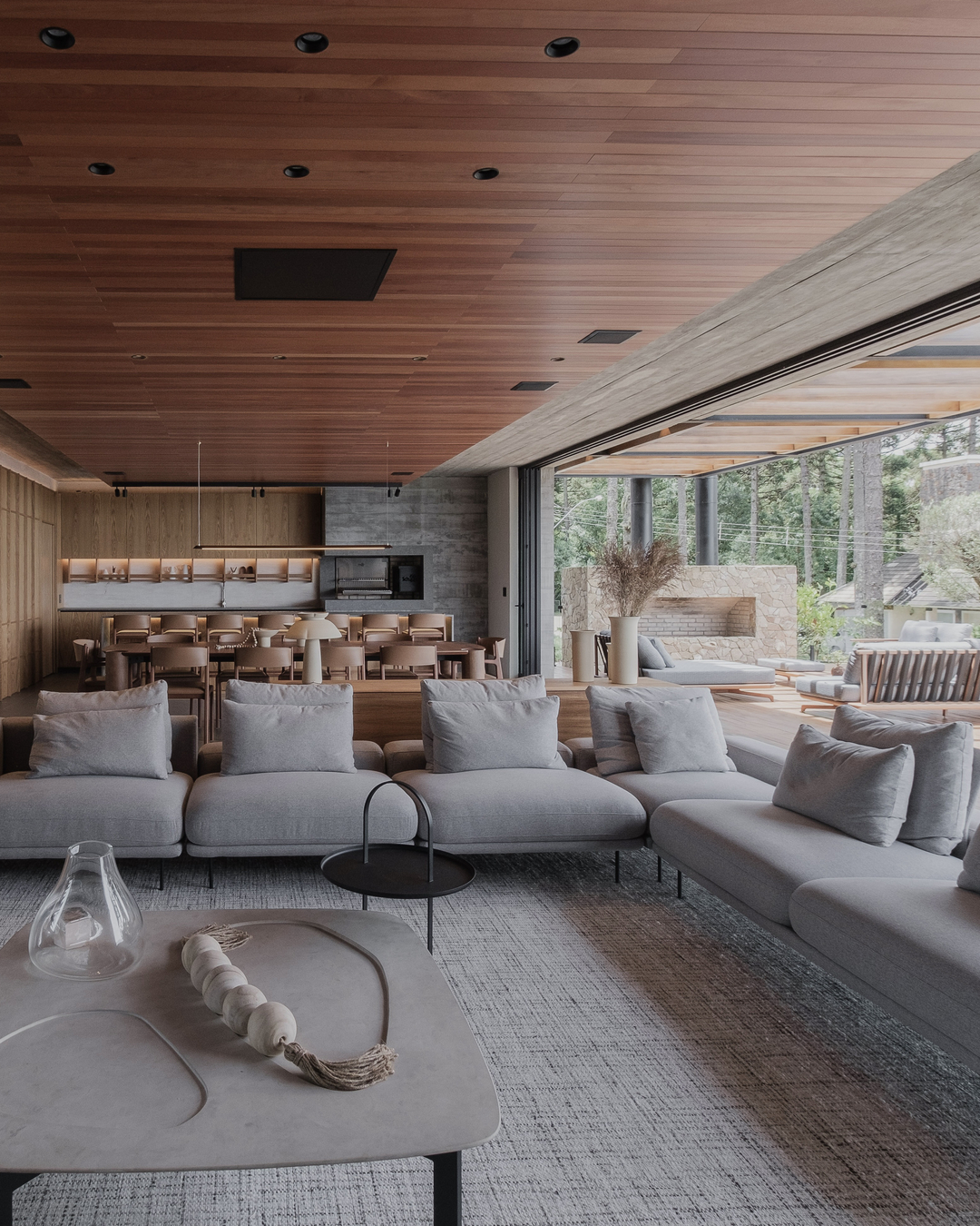 Para vestir com personalidade os interiores desta casa em Gramado, as arquitetas Ana Colnaghi, Sabrina Hennemann, Pâmela Bohn e Júlia Cadore e o engenheiro João Pedro Colnaghi apostaram em extensas superfícies de madeira, travertino, concreto e pedra, contrapondo nuances quentes e frias. À paleta cinza acrescentaram o caramelo de parte do mobiliário. No subsolo, a adega se configura como local para recepções intimistas.