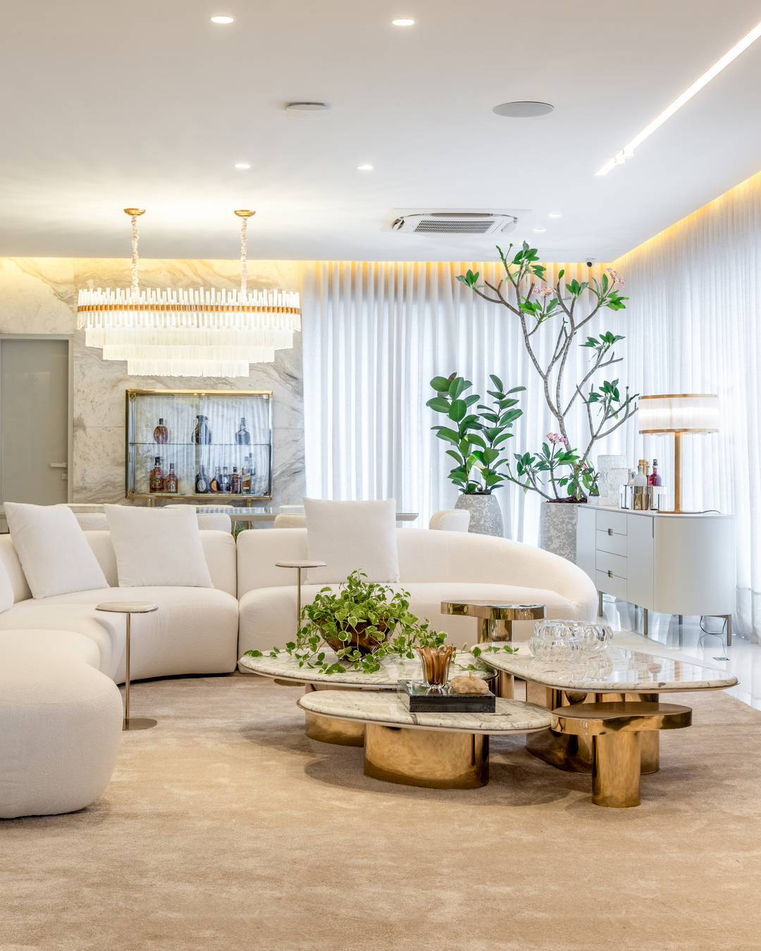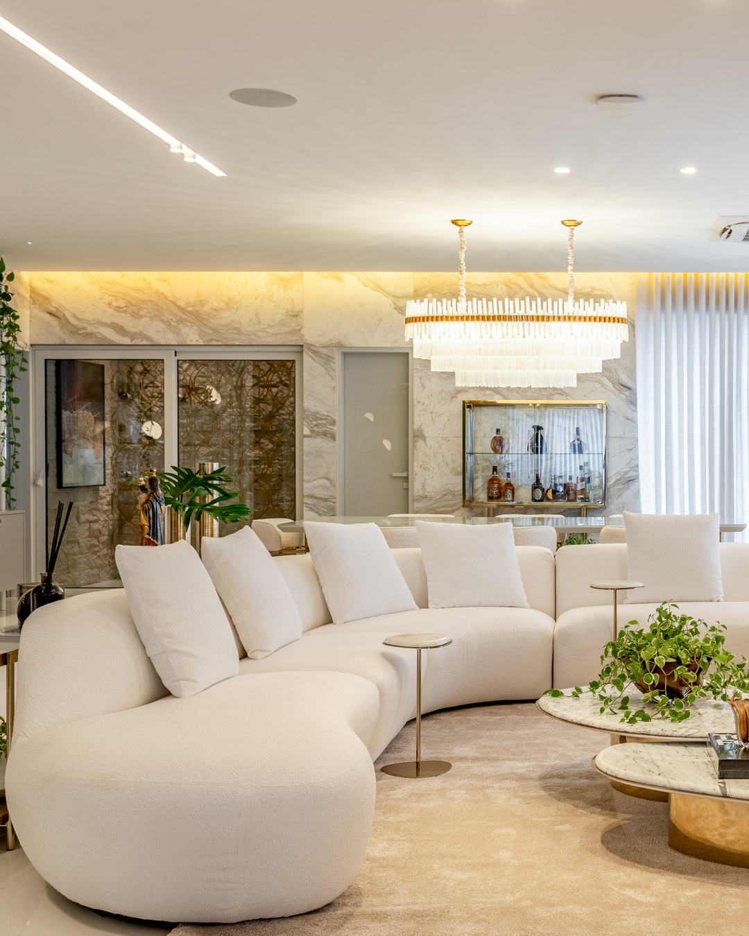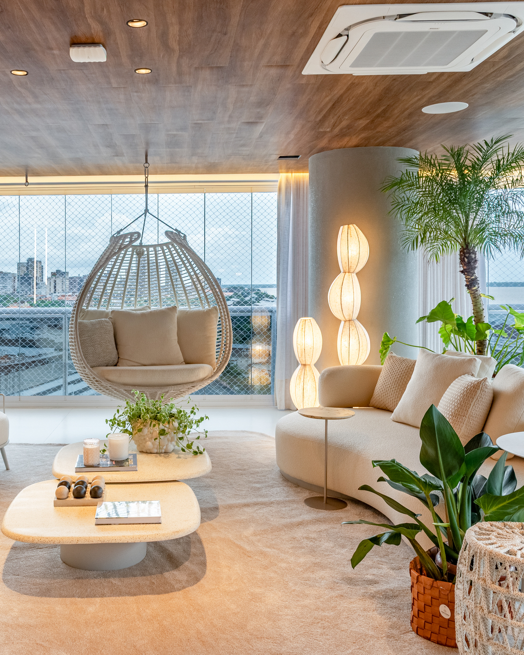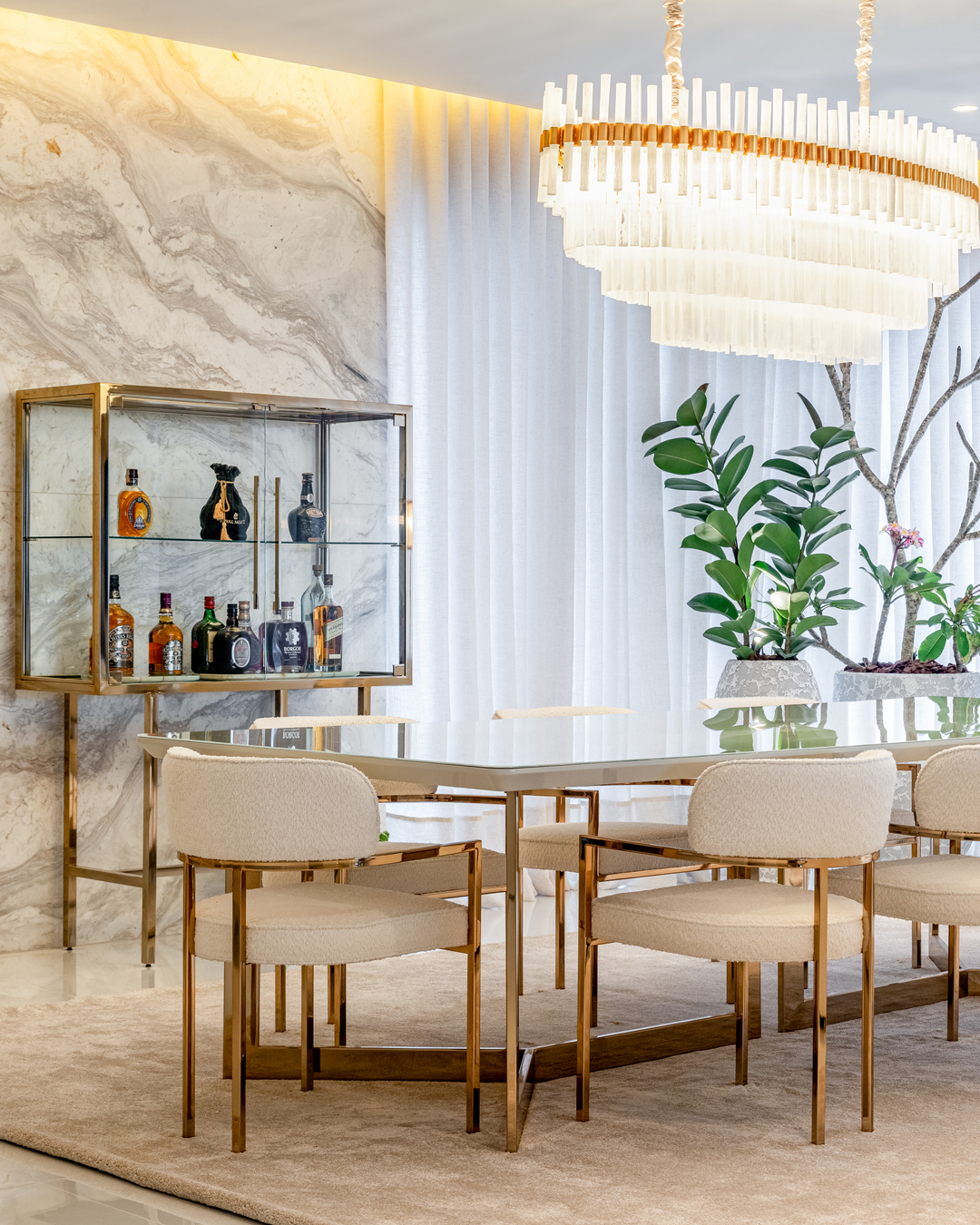 A sofisticação era fundamental para os proprietários do apartamento de 620 m² com vista para a Baía do Guajará, o que justifica os revestimentos nobres, como o mármore grego volakas, e as peças de design assinado, a exemplo das luminárias de Adriana Yazbek na ampla varanda. Mas eles queriam, igualmente, aconchego e funcionalidade, tanto que pediram cinco suítes, sala de cinema e adega climatizada, entre outros ambientes.